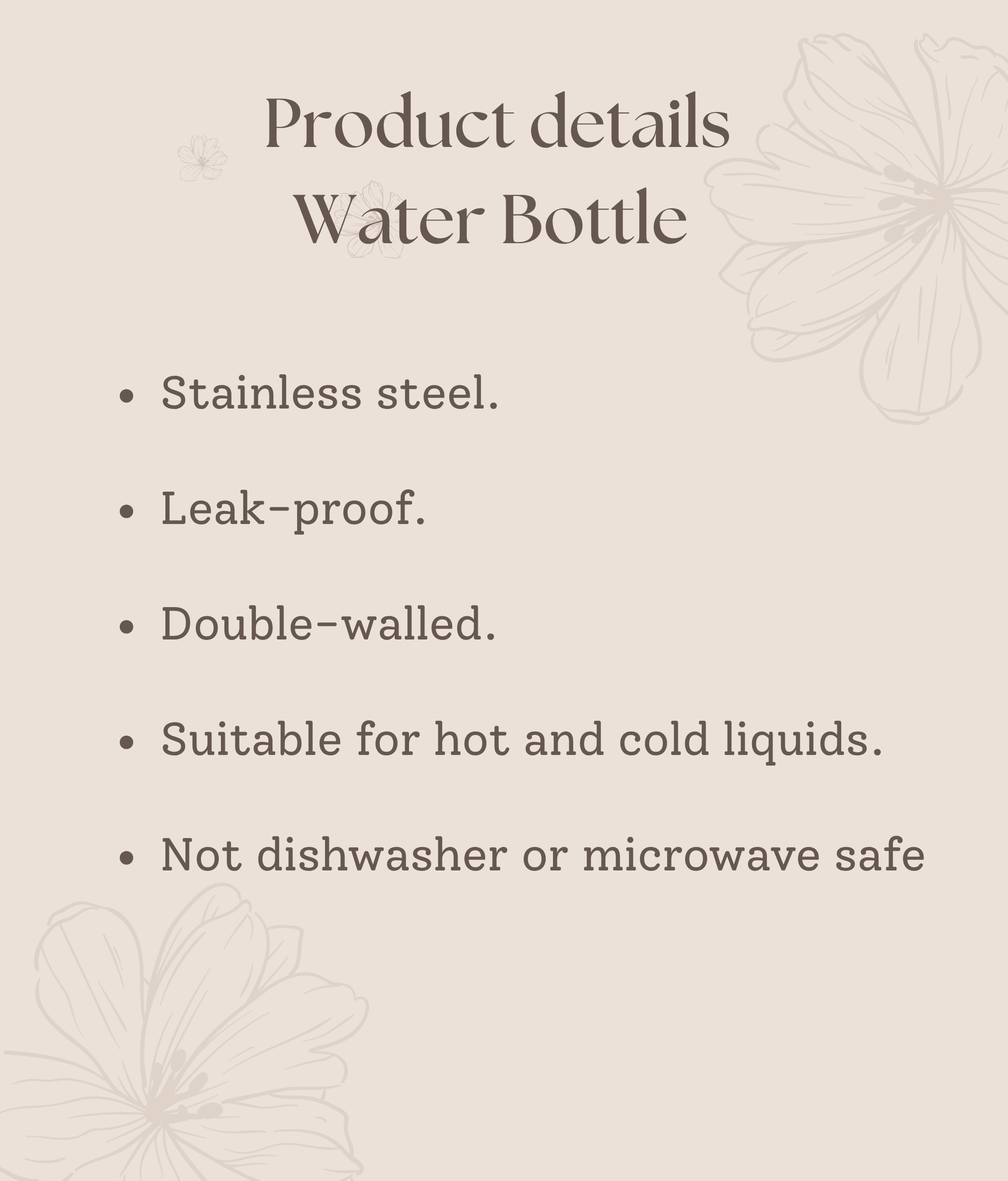 Stainless steel. Leak-proof. Double-walled. Suitable for hot and cold liquids. Not dishwasher or microwave safe.