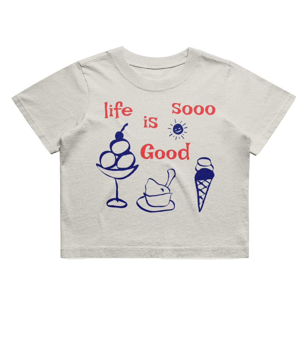 Celebrate sunny days in style with the “Life is Sooo Good” heavy faded cropped tee for women. Made from 100%...