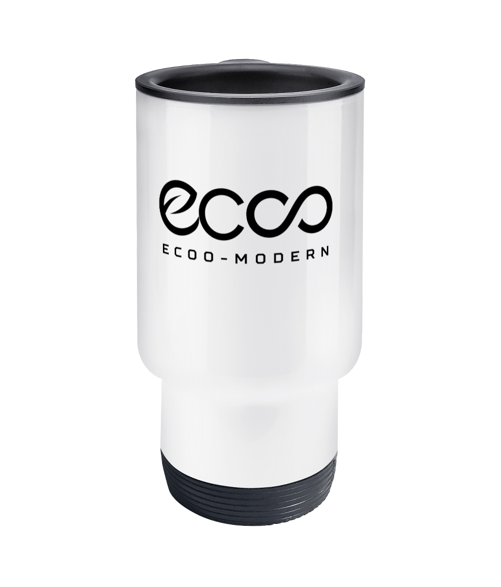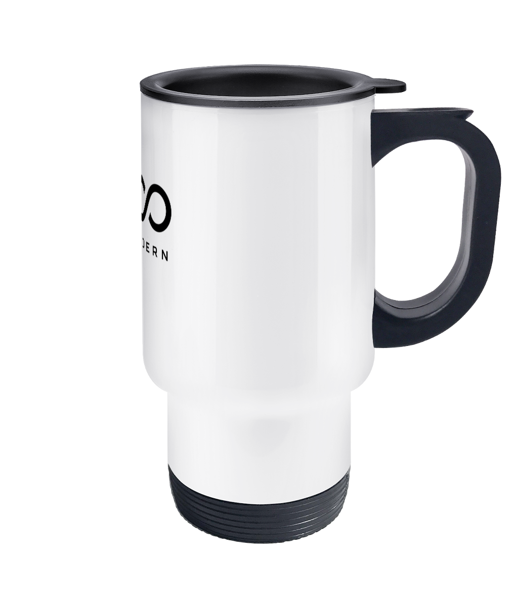 14oz stainless steel travel mug. Matte white finish. Not dishwasher or microwave safe.